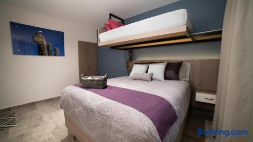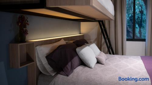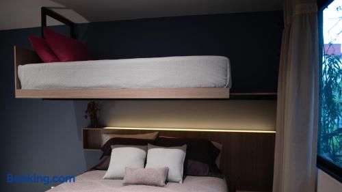 The room is ideal for groups of up to 3 adults. It features a queen-size bed with a twin bunk-style bed on top, a roll-out under-bed, and a private bathroom. Guests enjoy shared kitchens, dining room, roof garden, lounge, and washer/dryer. Features: Work desk, Google Home flat-screen TV & speaker, Dolce Gosto coffee maker, hair dryer, iron and board, wardrobe, self-check-in (Smartlock). Max occupancy: 3 adults, or 2 adults + 2 small children who share the queen bed while adults use overhead.