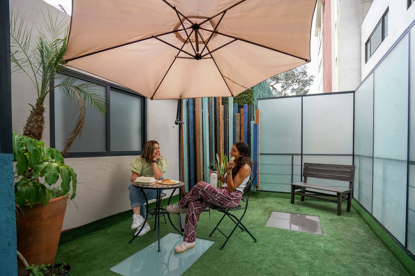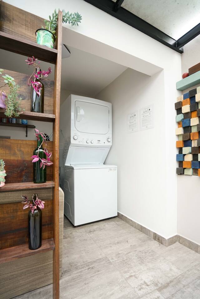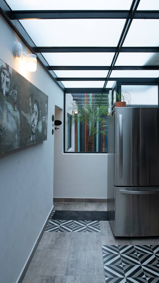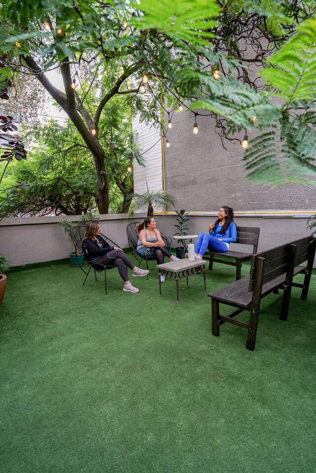 "The cozy terrace room embodies the expressive power of Clemente Orozco..." Casa Carmelia celebrates the art that shaped Mexico. "José" (#06) Room on our magnificent shared terrace is ideal for two guests. Double-size bed, private bathroom & modern tech for remoting. Just steps from the bustling Condesa scene, surrounded by restaurants, bakeries, boutiques, bars, and lush parks. Fully-equipped kitchens & dining. Enjoy the vibrant energy of La Condesa. 🚧 neighbor construction. Earplugs avail