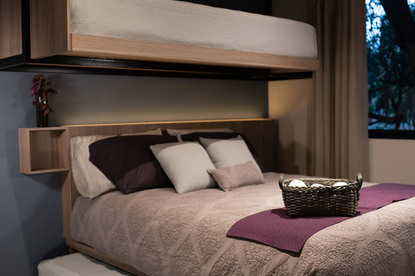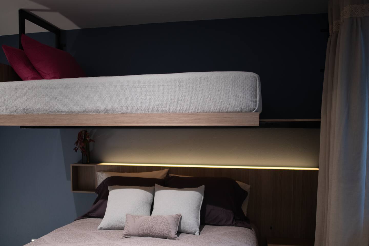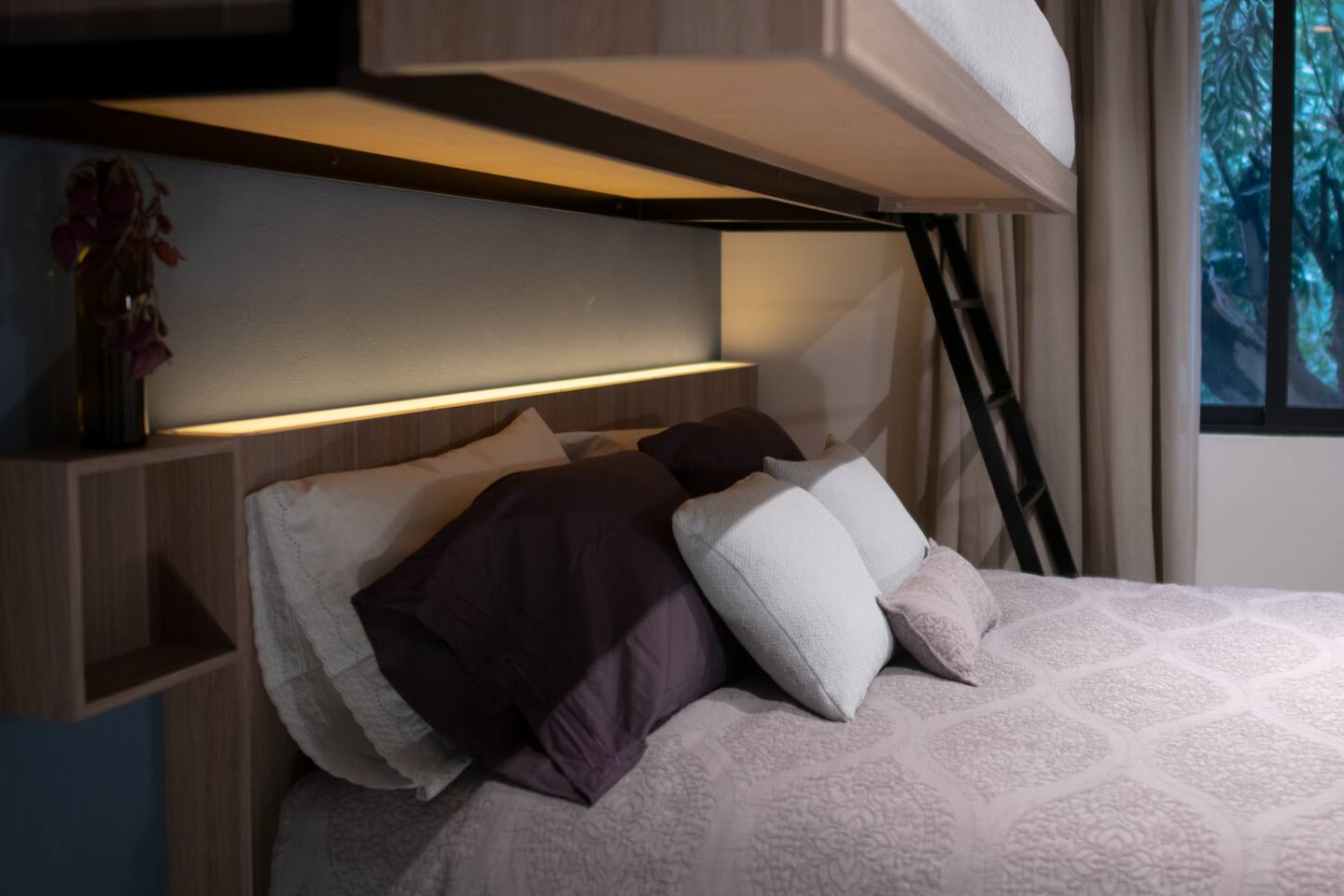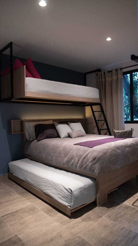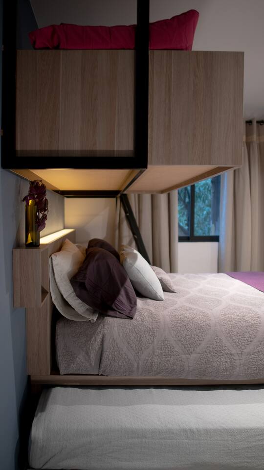 The room is ideal for groups of up to 3 adults. It features a queen-size bed with a twin bunk-style bed on top, a roll-out under-bed, and a private bathroom. Guests enjoy shared kitchens, dining room, roof garden, lounge, and washer/dryer. Features: Work desk, Google Home flat-screen TV & speaker, Dolce Gosto coffee maker, hair dryer, iron and board, wardrobe, self-check-in (Smartlock). Max occupancy: 3 adults, or 2 adults + 2 small children who share the queen bed while adults use overhead.